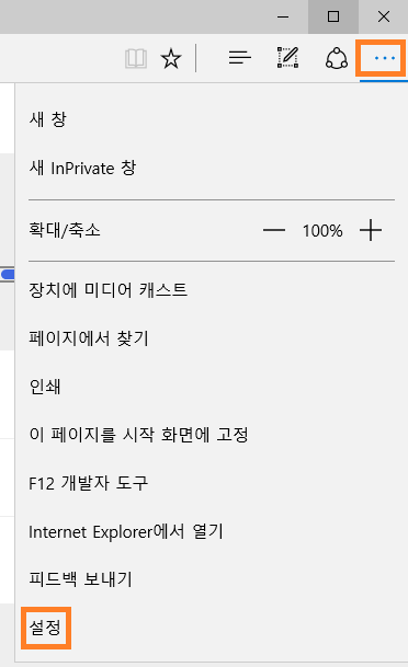 - 아래 그림과 같이 Microsoft Edge에서 우측 상단의 **…**아이콘을 클릭한 후 설정을 클릭합니다.