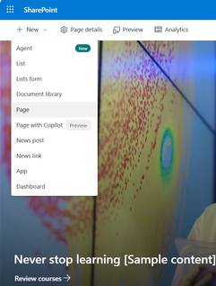 - Navigate to the home of your HR site and click New > Page.